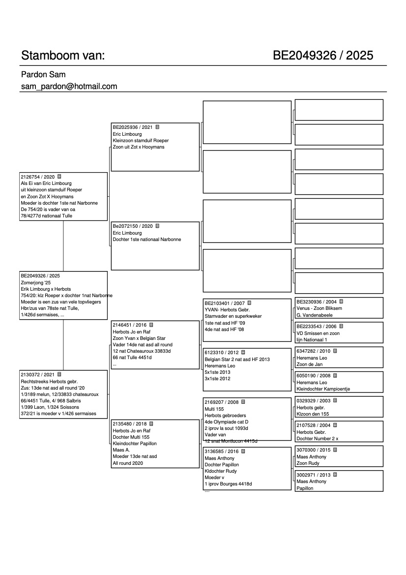Vader is de 754/20. Rechtreeks Eric Limbourg (oude ring 2022) en is een zoon uit kleinzoon stamduif Roeper x Hooymans x dochter van 1ste nationaal Narbonne.
