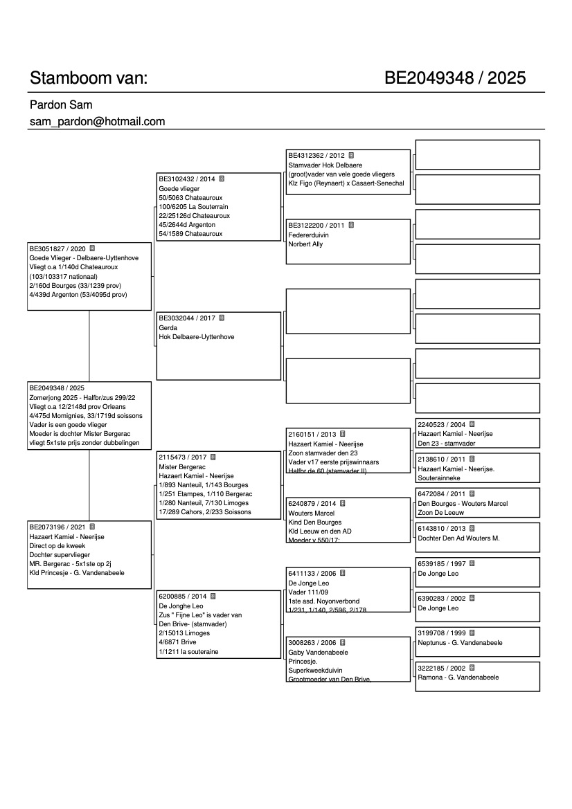 Zijn moeder is een dochter uit supervlieger Mister Bergerac welke 5x 1ste prijs vliegt tot Bergerac.