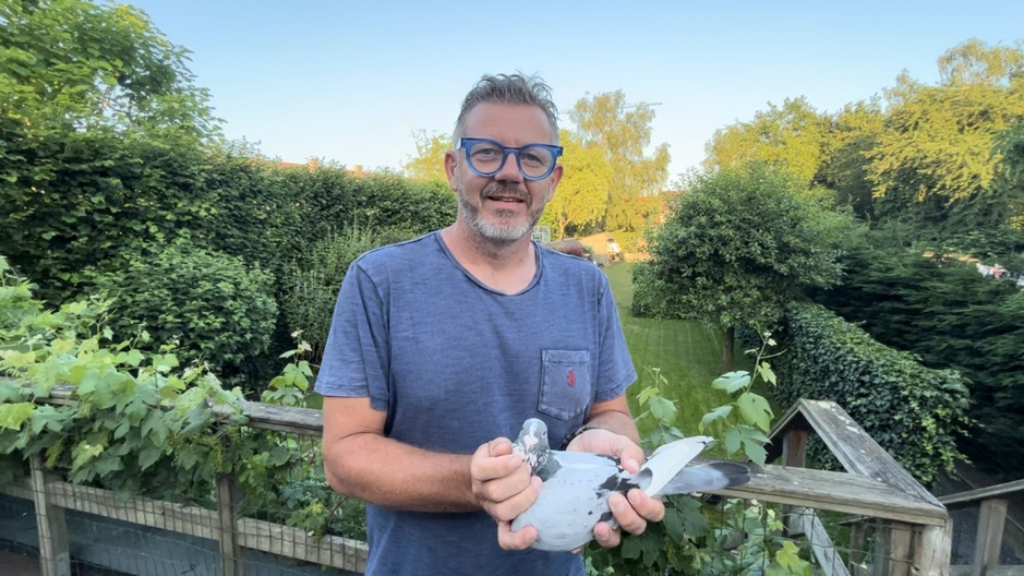 De voorzitter van De Arend Rekkem schenkt hier een jonge duif op afspraak