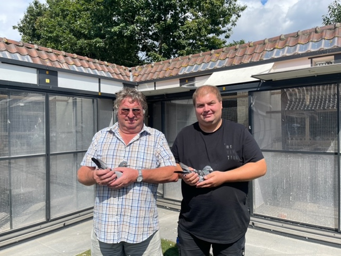 Deze 2 sympathieke toppers bieden hier 12 vliegers aan die in het hok van Dany Vandenberghe (onze West-Vlaamse voorzitter) hebben gevlogen.